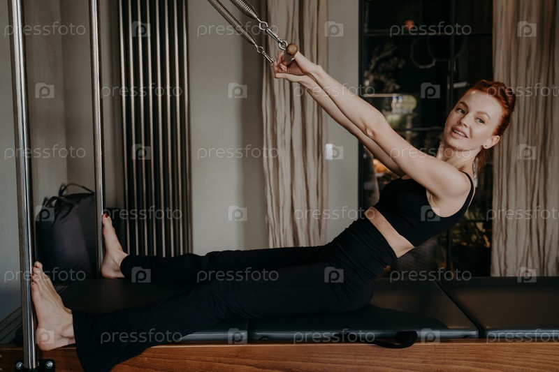 Молодая красивая женщина с улыбкой делает упражнения на реформаторе пилатеса