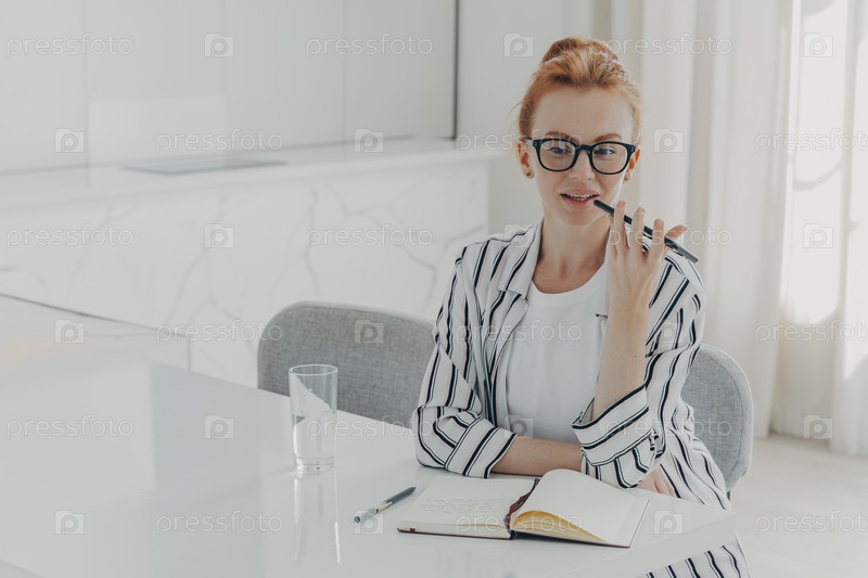 Фотография рыжеволосой молодой женщины записывает голосовой вызов через микрофон смартфона сидит за рабочим столом делает заметки в блокноте пьет пресную воду использует голосовой поиск приложение персональной справочной службы записывает напоминание