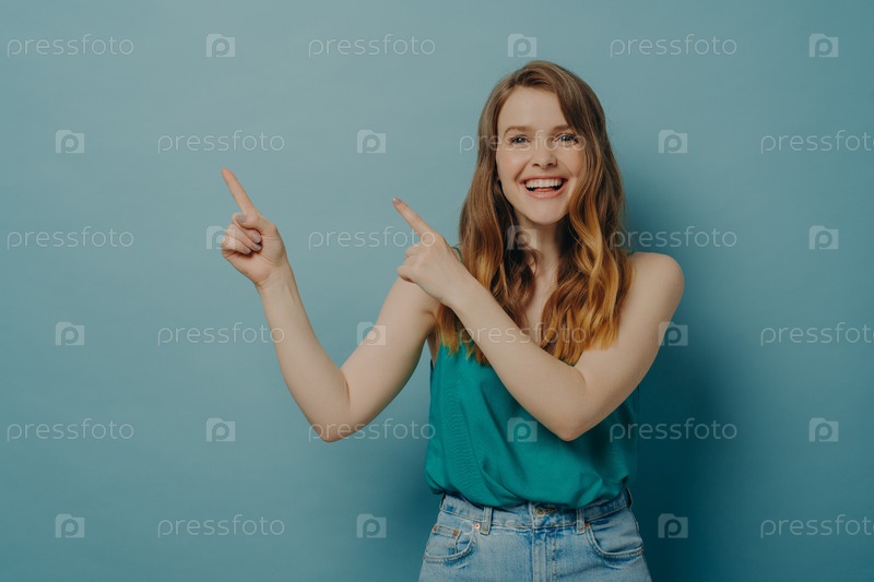 Позитивная взволнованная женщина указывает на правую сторону пальцами обеих рук, рекламируя продукт