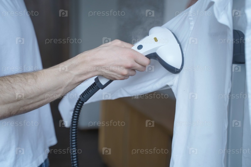 Обрезанный снимок мужчины, использующего электрический отпариватель для одежды во время отпаривания в классической рубашке дома