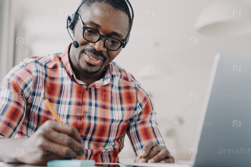 Афроамериканец в наушниках ведет видеочат на ноутбуке. Дистанционный урок. Служба поддержки клиентов