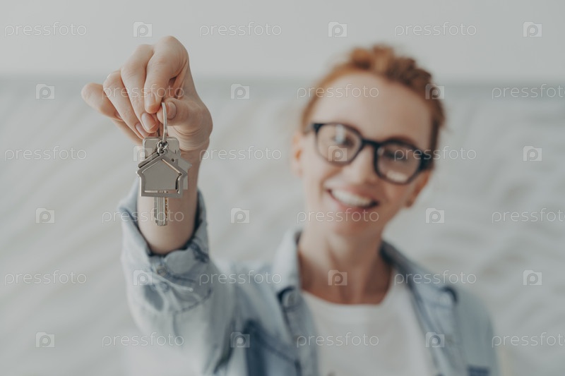 Молодая счастливая улыбающаяся рыжеволосая женщина в повседневной одежде с ключами от своего нового дома