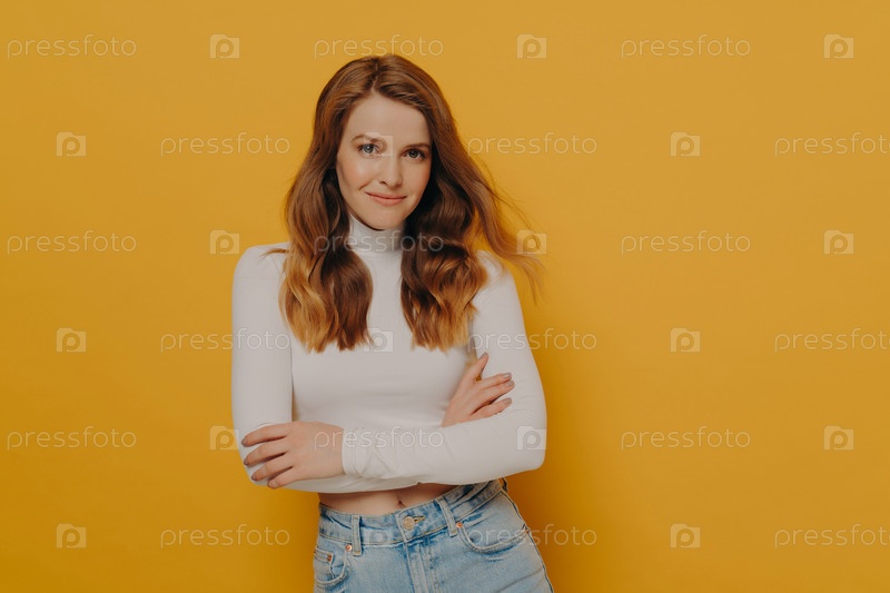 Очаровательная милая женщина держит руки скрещенными и смотрит в камеру с доброй улыбкой на лице