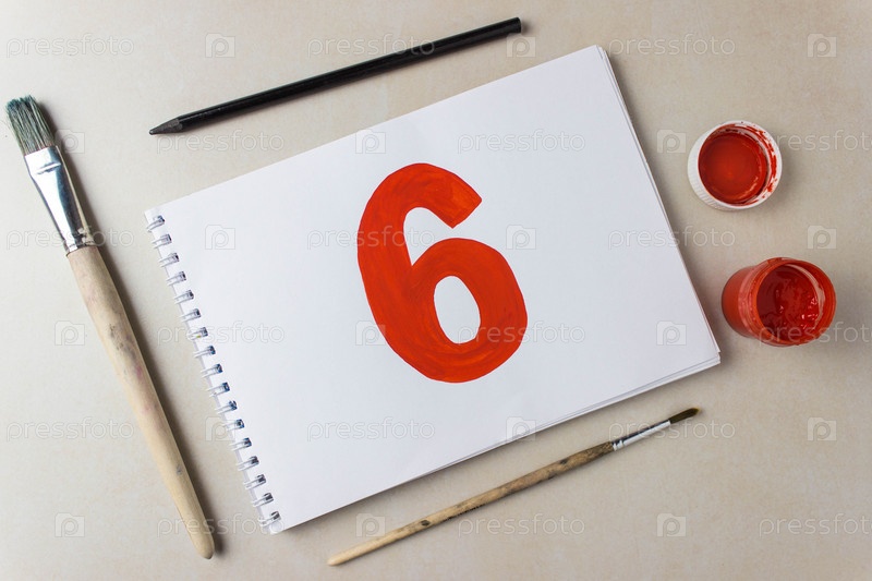 Красный рисунок номер шесть на белом альбомном листе. Рядом кисти и баночка с краской
