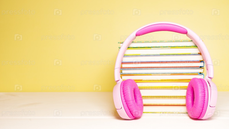 Стопка книг на столе, на переднем плане наушники