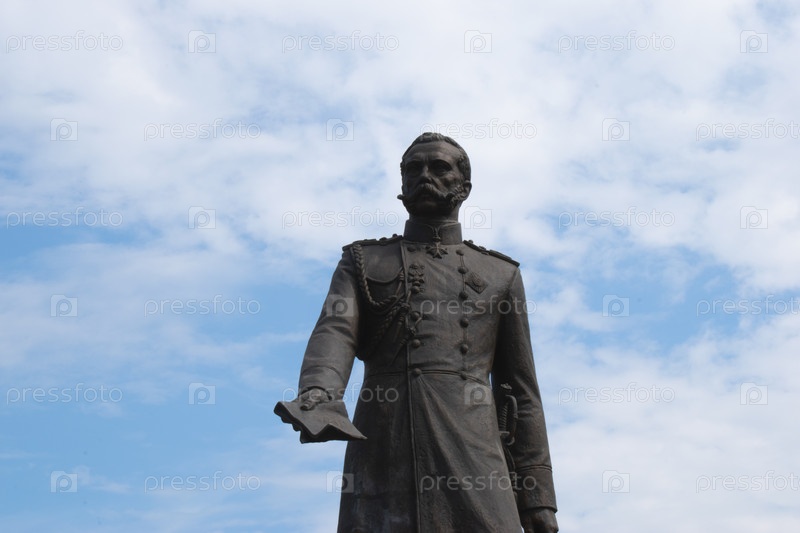Памятник русскому царю-освободителю императору Александру II в черном на фоне красивого синего неба с облаками крупным планом, держащего книгу или бумагу