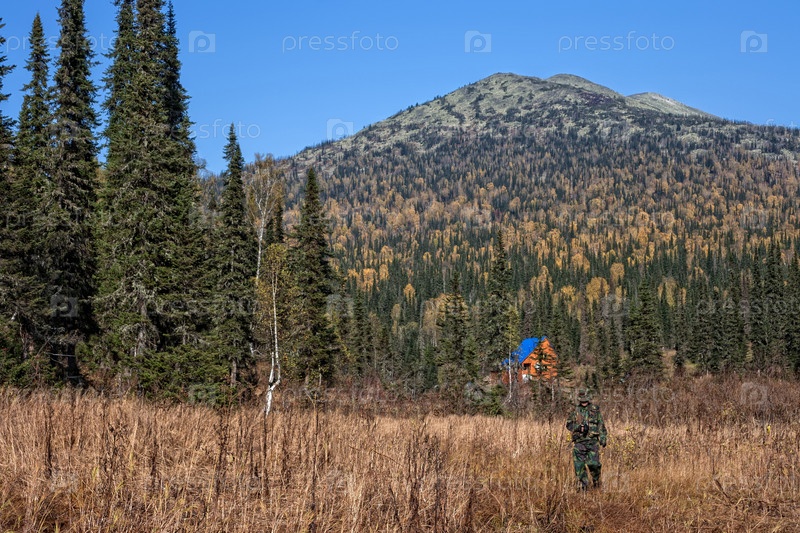 Горы Кузнецкий Алатау. Осенний вид в лесу. Мужчина в военной форме в лесу