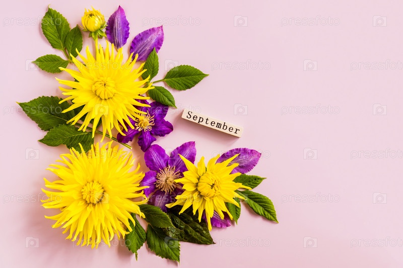 Вид сверху деревянного календаря с сентябрьским словом и желтыми георгинами, фиолетовыми клематисами. пастельный фон. копия пространства