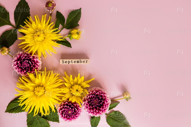 Красивые яркие георгины, осенние цветущие цветы в композиции с деревянным календарем. Сентябрь. вид сверху. плоская планировка. место для текста