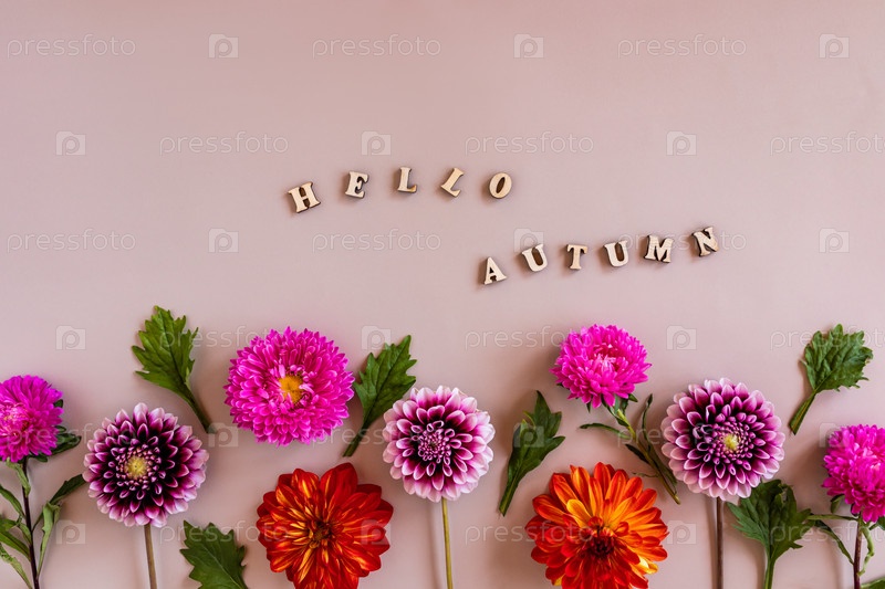 Вид сверху на цветочную кайму из осенних разноцветных цветов и текст из деревянных букв - привет осень. пастельный фон