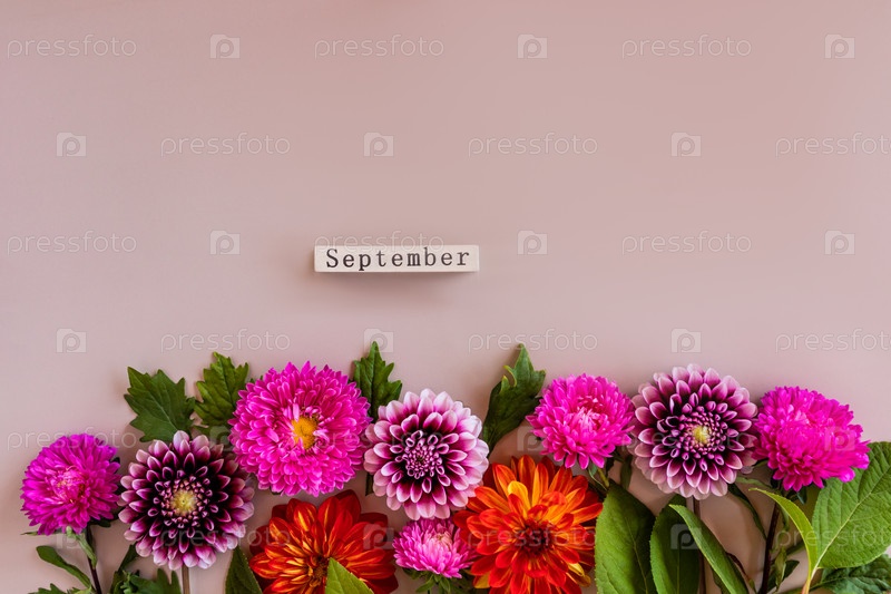 Осенняя яркая кайма из срезанных садовых цветов. красивые георгины и астры на бежевом фоне с деревянным календарем. Сентябрь. вид сверху