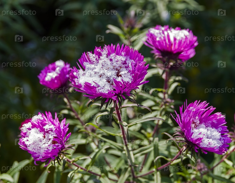 Снег на цветах мелких садовых хризантем. Осень, конец октября