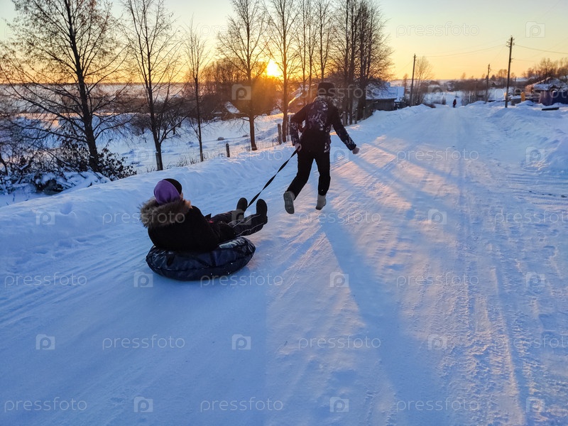 Дети катаются на тюбинге зимним закатным вечером
