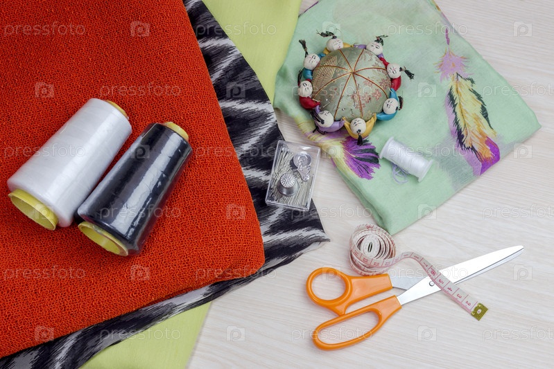 Ткань, ножницы и различные швейные принадлежности на деревянном столе крупным планом