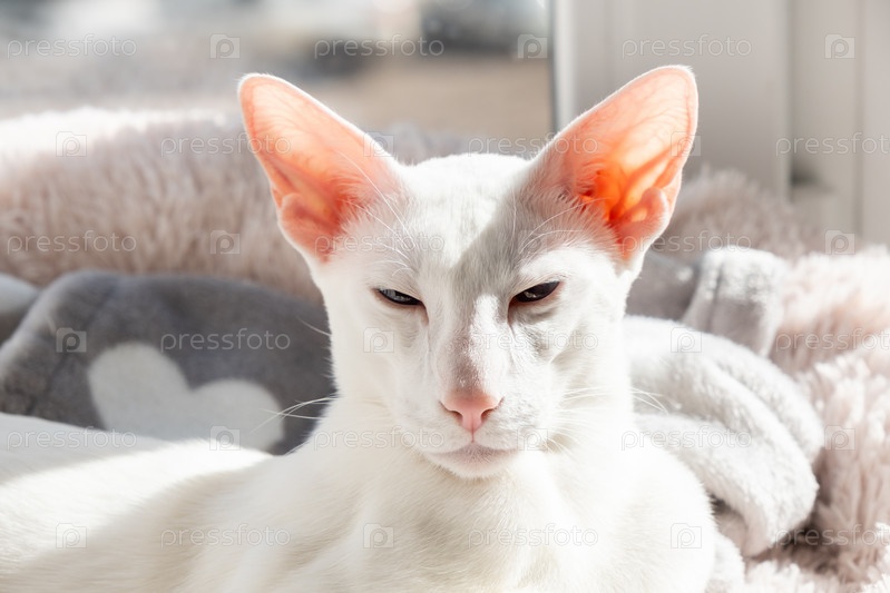 Ориентальная короткошерстная белая кошка лежит у окна