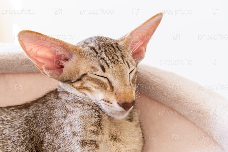 Ориентальный короткошерстный полосатый котенок спит в гамаке