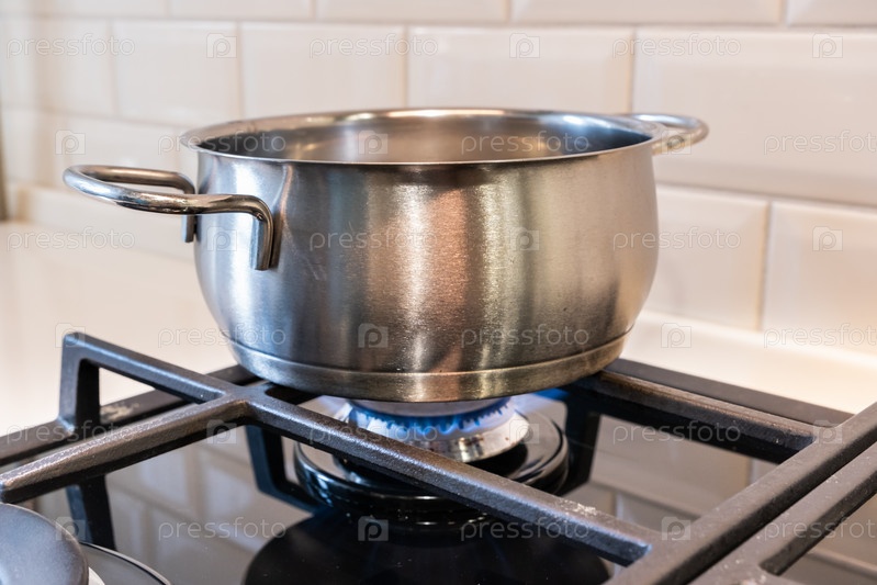 Кастрюля находится на газовой горелке плиты