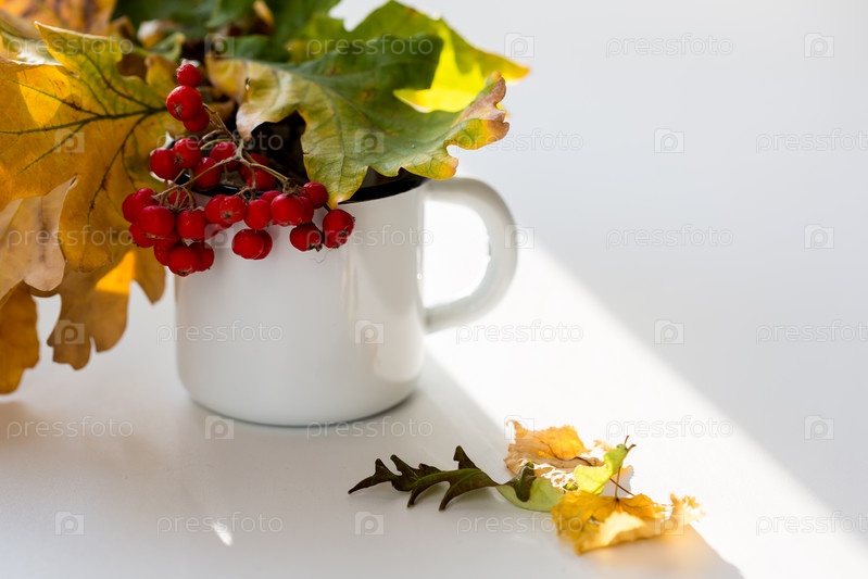 Осенняя композиция с букетом желтых осенних листьев и веточками рябины в чашке. Концепция осеннего сезона, пространство для копирования