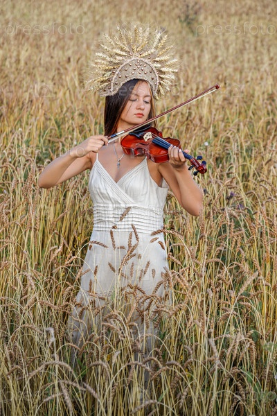 Девушка с колосьями и скрипкой в поле
