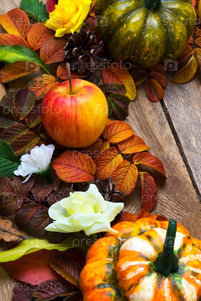 Украшение на День Благодарения яблочными, зелеными и оранжевыми тыквами