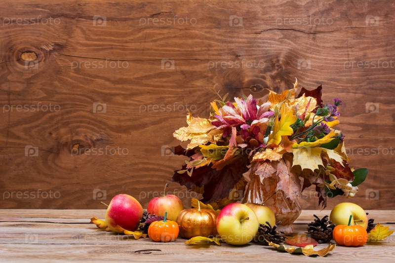Центральная часть благодарения с букетом осенних листьев и яблоками,