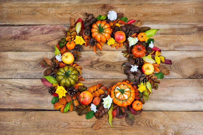 Венок на День благодарения с тыквами, желтыми розами и белыми цветами, вид сверху