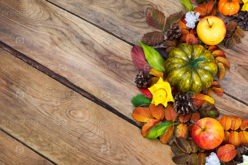 Зеленая тыква на День благодарения, яблоки, венок из желтых роз, пространство для копирования