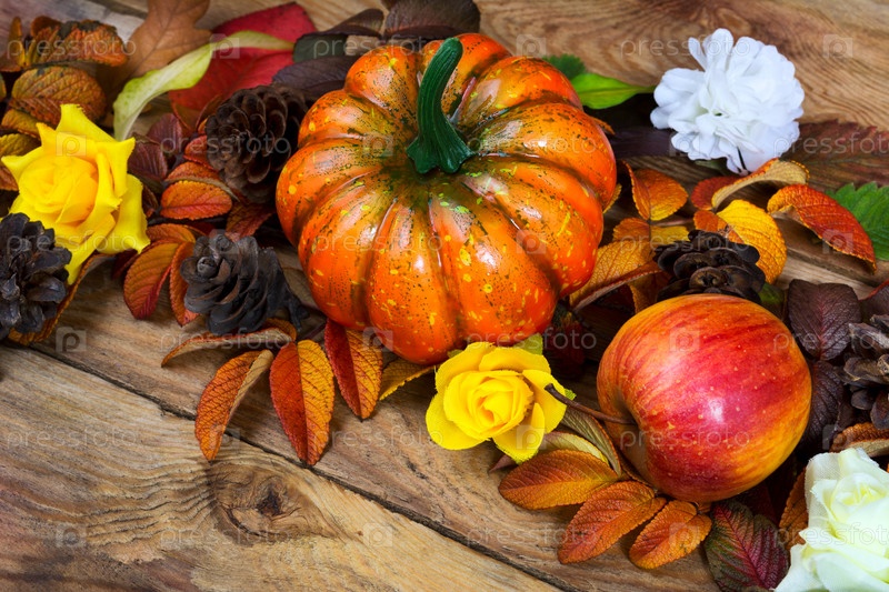 Апельсиновая тыква на День благодарения, яблоко, венок из сосновых шишек, крупным планом