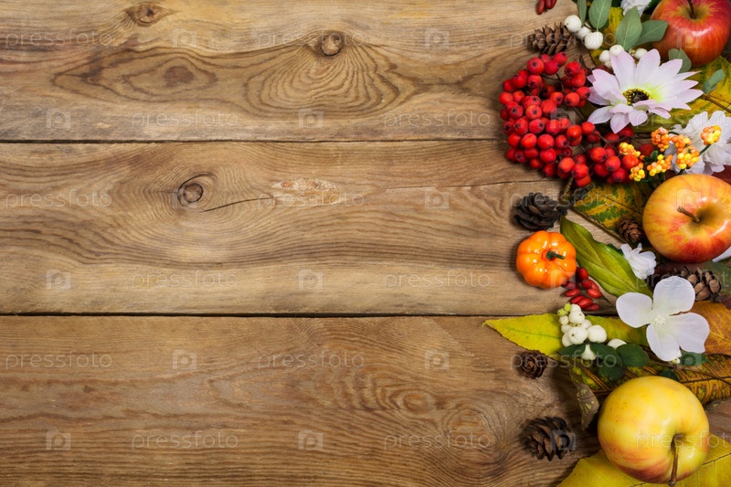 Фон благодарения с ягодами рябины и белыми цветами, пространство для копирования