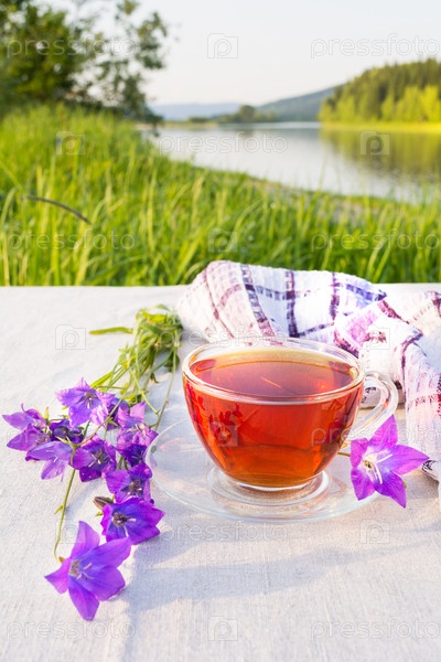Чашка чая с синими колокольчиками на берегу реки