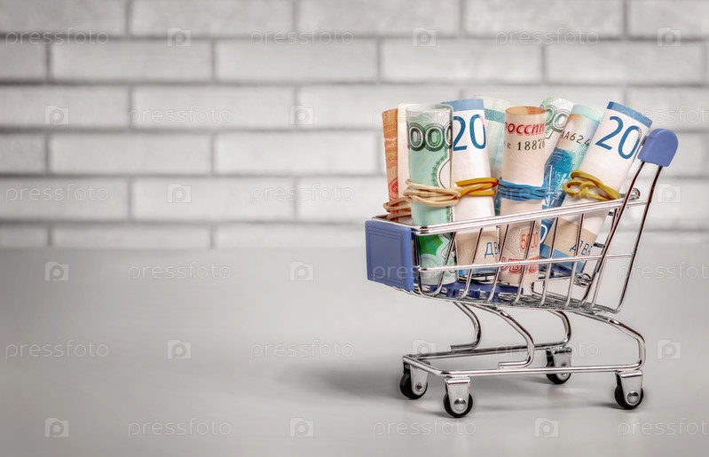 Рулоны бумажных денег в тележке из супермаркета у кирпичной стены. Покупка и продажа, потребительская концепция