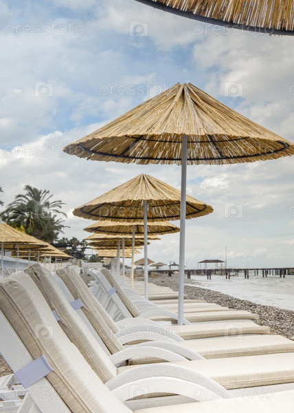 Шезлонги и зонтики стоят в ряд на берегу моря