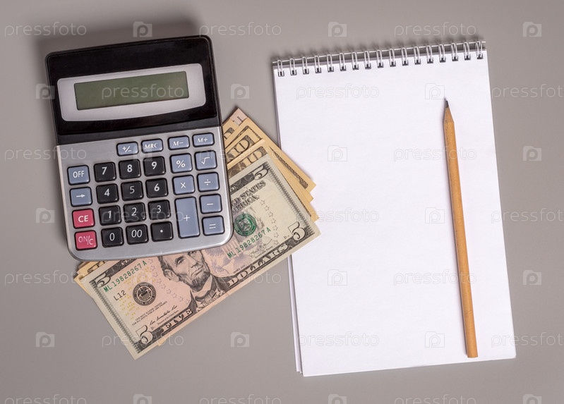 Американская валюта, калькулятор и карандаш с блокнотом. Вид сверху