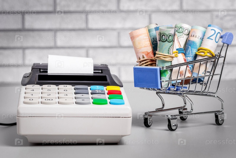 Тележка для покупок с русскими рублями и кассовым аппаратом. потребительская концепция