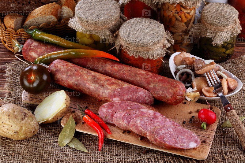 Натюрморт с варено-копченой колбасой на деревянном фоне