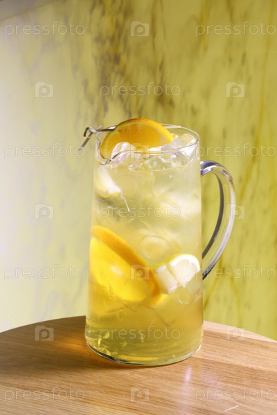 Стеклянный кувшин с лимонадом из апельсинов и лимонов на деревянном столе