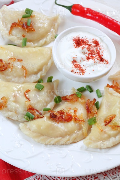 Вареники с картошкой и сметаной на белом фоне