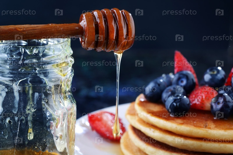 Панкейки с черникой, клубникой, медом на синем фоне