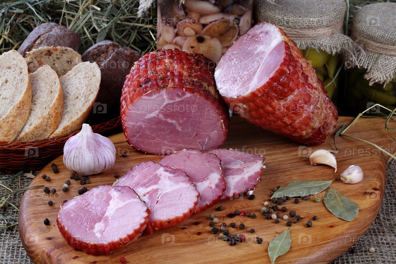 Натюрморт с варено-копченой колбасой на деревянном фоне