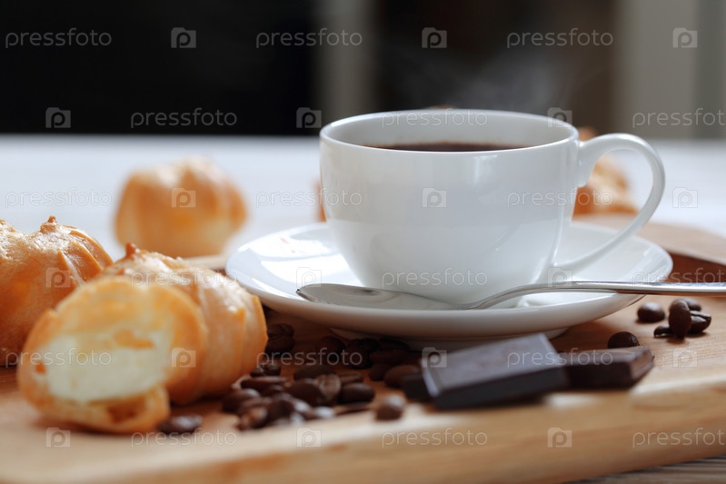 Профитроли с кофе и шоколадом на белом фоне