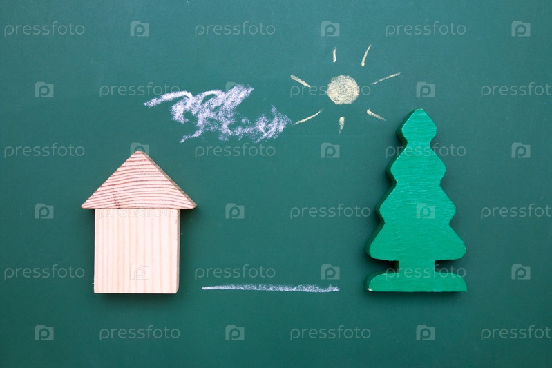 Деревянный игрушечный домик на зеленой доске, нарисованное облако и солнце, деревянное дерево, копия пространства, вид сверху