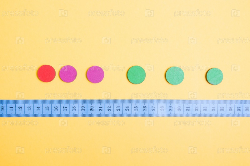 Деревянные разноцветные круги на желтом фоне, социальная дистанция, распространение коронавируса, карантин и пандемия 2020