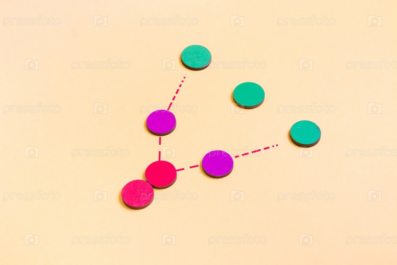Деревянные разноцветные круги на желтом фоне, концепция социальной дистанции, распространение коронавируса, карантин и пандемия 2020