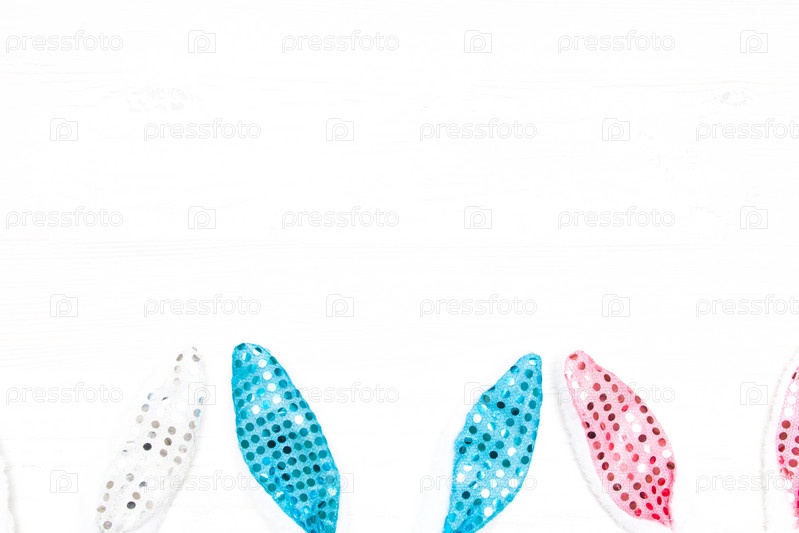 Разноцветные блестящие плюшевые кроличьи уши на белом фоне, карнавальные уши на повязке, пространство для копирования, пасхальный фон