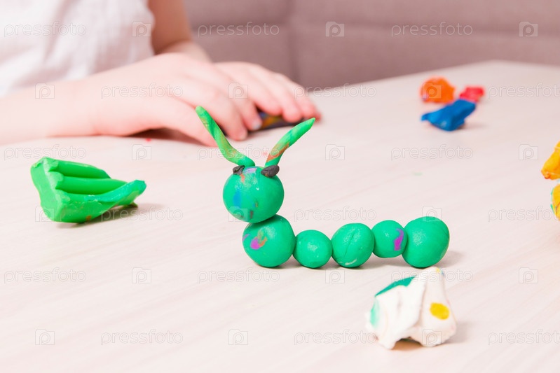 Маленький ребенок лепит гусеницу из зеленого пластилина на деревянном столе, развитие мелкой моторики рук, игра с ребенком дома, гусеница из пластилина на переднем плане