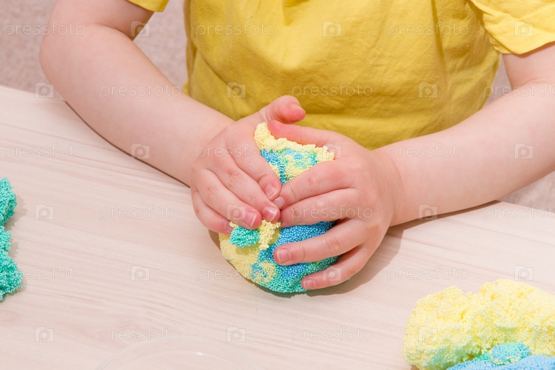 Ребенок играет в пластилин из гранул полимера за столом, оригинальный пластилин из крохотных шариков, развитие мелкой моторики рук, игры с ребенком дома