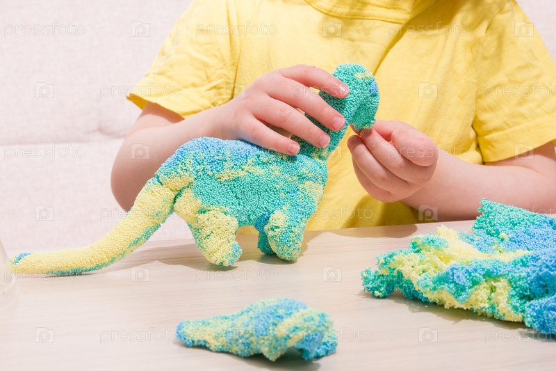Ребенок играет за столом в пластилин из полимерных гранул, оригинальный пластилин из крохотных шариков, ребенок играет с динозавром из пластилина, во что поиграть с ребенком дома