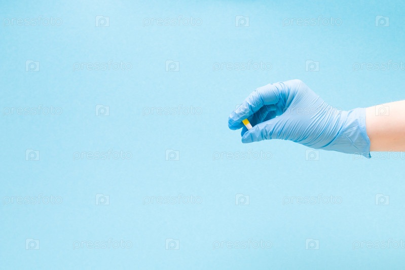 Женская рука в синей резиновой медицинской перчатке держит капсульную таблетку на синем фоне копировального пространства, таблетку белого и желтого цвета, концепцию лечения и здравоохранения