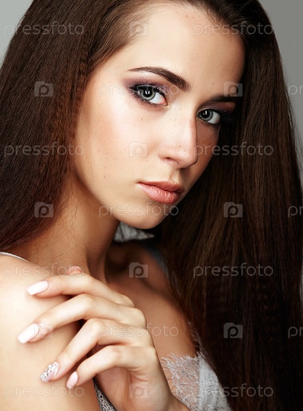 Крупным планом портрет красоты молодой женщины. Брюнетка с длинными волосами и дневным женским макияжем