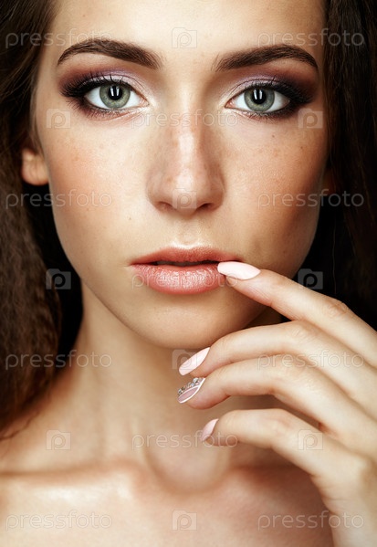 Портрет красоты молодой женщины, касающейся лица пальцами. Брюнетка с длинными волосами и дневным женским макияжем на сером фоне